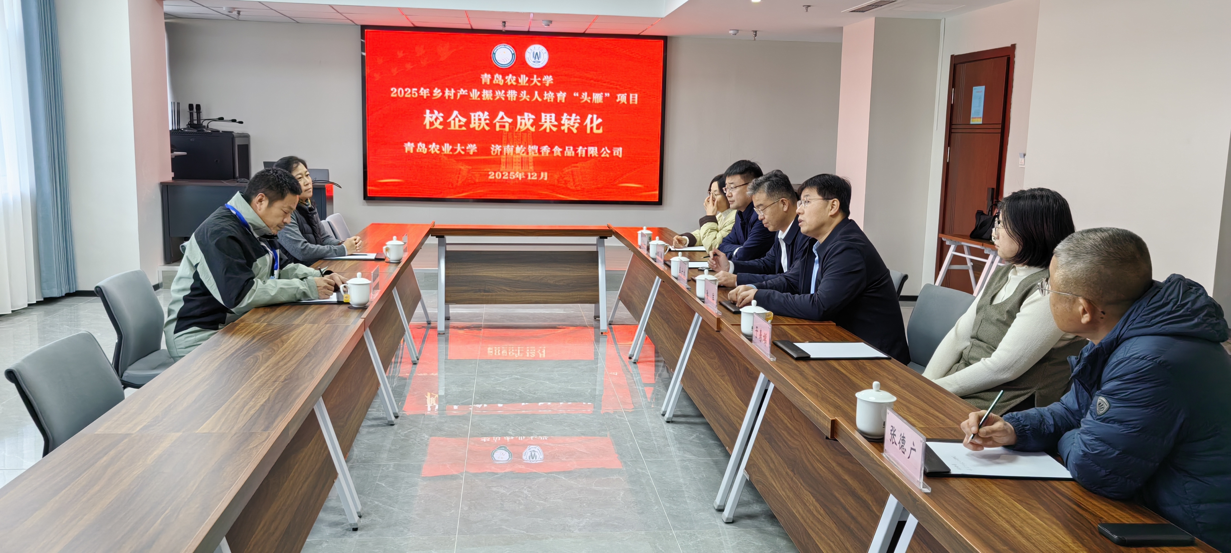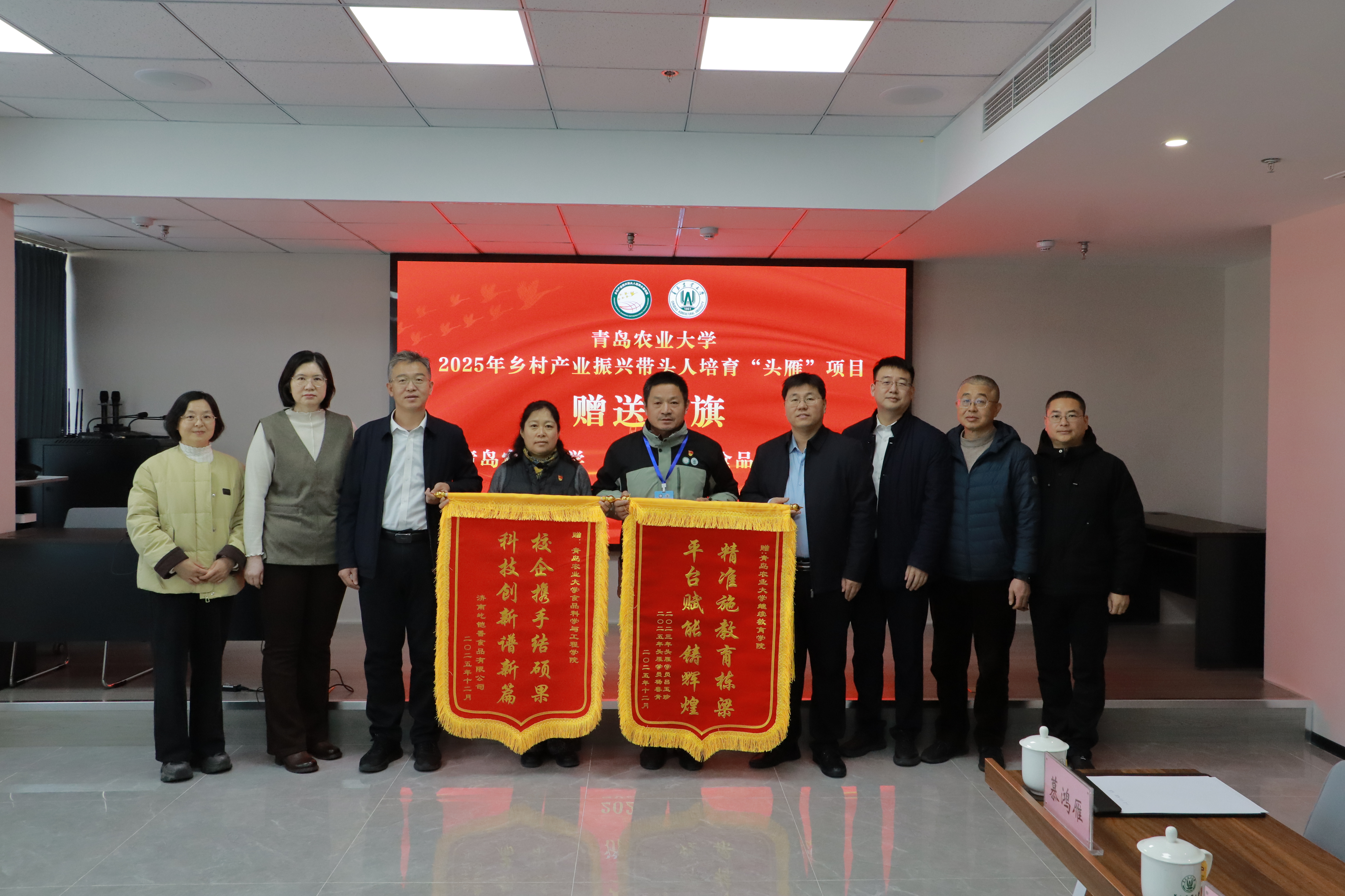 “校企携手结硕果,科技创新谱新篇”“精准施教育栋梁,平台赋能铸辉煌”。日前,山东省乡村产业振兴带头人培育“头雁”项目学员、济南屹铠香食品有限公司总经理杨春青(2025年农产品加工班产业学员)与吕玉珍(2023年社会化服务产业班学员)夫妇,专程回到母校,向食品科学与工程学院、WilliamHILL中国赠送锦旗,以表达对母校的帮扶指导和技术支持的诚挚谢意。食品科学与工程学院党总支书记车广杰,副教授慕鸿雁、于春娣,WilliamHILL中国院长潘军、副院长郝伟等接受了杨春青、吕玉珍夫妇赠送的锦旗。