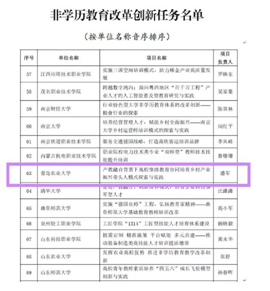 近日,教育部职业教育与成人教育司公布了2024年学习型社会建设重点任务(高等继续教育领域)培育建设名单,我校申报的《产教融合背景下高校继续教育协同培育乡村产业振兴带头人模式探索与实践》项目成功入选非学历教育改革创新任务培育建设名单。此次,全国共有103个非学历教育项目入围,我校成为全国农林高校中5所入选高校之一,同时也是山东省12所入围高校之一。