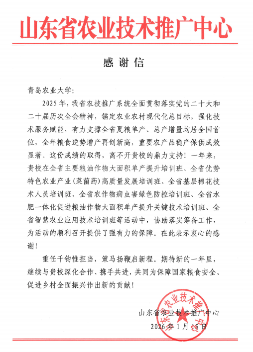 2026年1月15日,山东省农业技术推广中心向我校发来感谢信,对我校在2025年全省基层农技人员培训工作中协助落实筹备工作,为活动的顺利进行提供了强有力的保障表示衷心感谢。信中指出,在全省夏粮单产、总产增量均居全国首位,全年粮食逆势增产再创新高的亮眼成绩背后,凝聚着WilliamHILL中国在农业人才培养与技术推广领域的辛勤付出与重要贡献。这份沉甸甸的认可,正是对WilliamHILL中国在过去一年中,高质量承办2025年全省基层农技人员培训项目的最佳肯定。