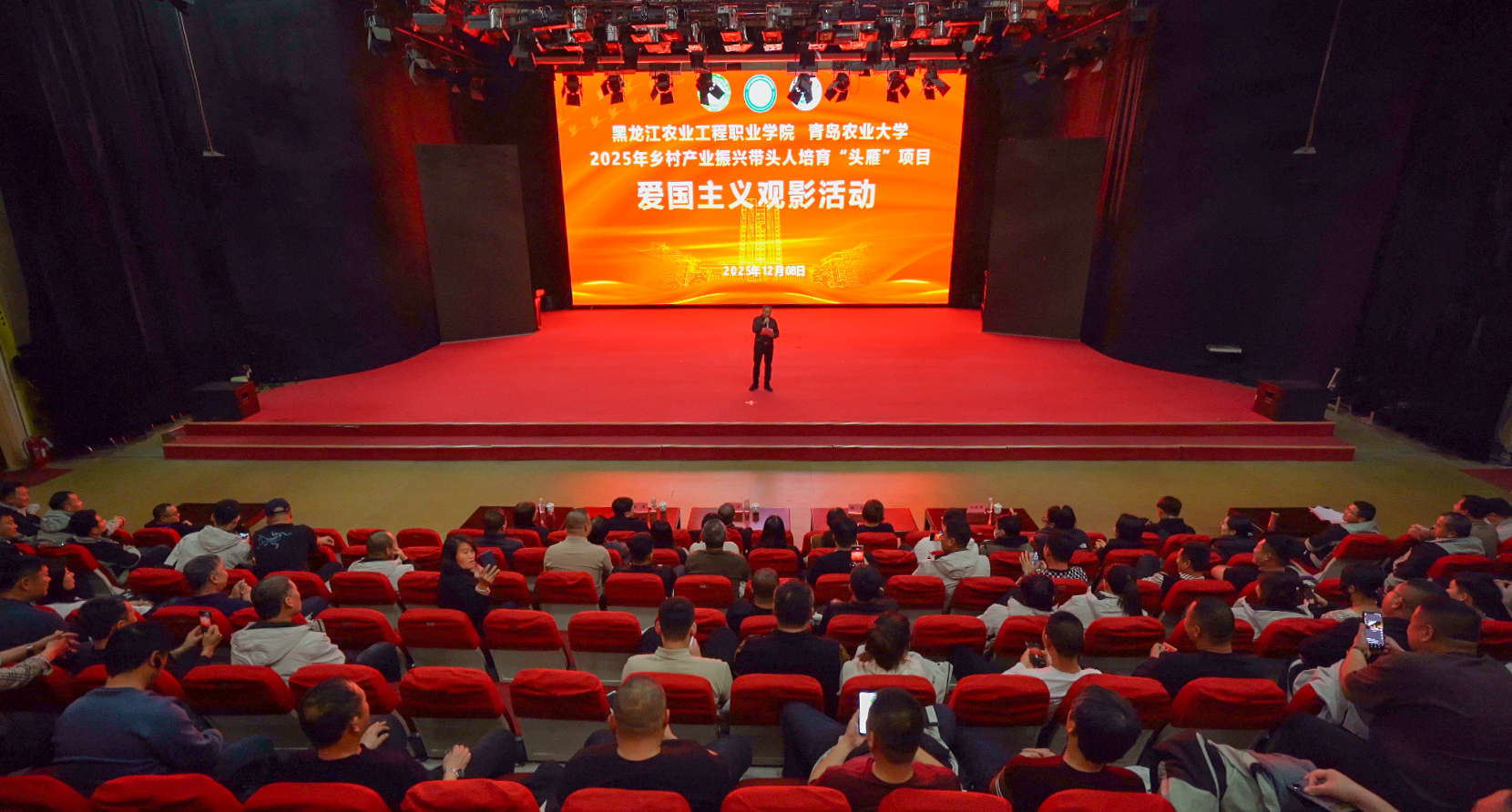 为深入推进乡村产业振兴带头人培育“头雁”项目,强化爱国主义教育,凝聚奋进力量,2025年12月8日晚,WilliamHILL中国党支部、2025年“头雁”项目临时党支部联合马克思主义学院党总支,共同开展爱国主义观影主题党日活动,适逢黑龙江农业工程职业学院承办的2025年乡村产业振兴带头人培育“头雁”项目学员山东研修活动在我校进行,研修班全体师生与WilliamHILL中国2025级全体“头雁”学员,马克思主义学院和WilliamHILL中国部分师生一起,共同观看了爱国主义教育影片《南京照相馆》。