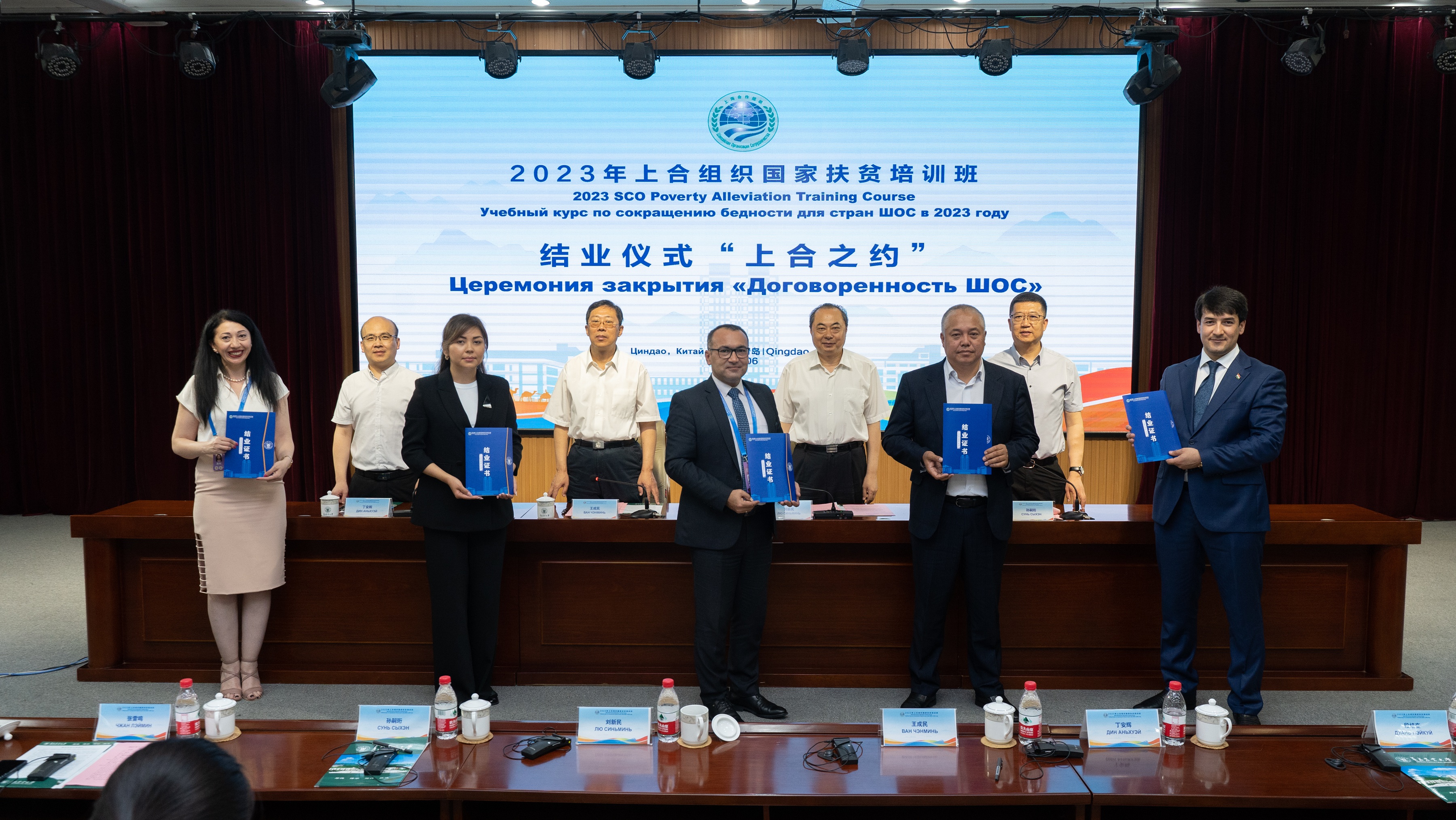 王成民充分肯定了培训班的效果,表示本次培训展示了中国气派、山东风格、青岛特色,是一次高水平、高质量的培训,希望在培训结束后,大家的友谊能够继续延续下去,共同发扬“上海精神”,推动上合组织国家在强化减贫合作、促进繁荣发展上走实走深。出席的领导为学员代表颁发结业证书。