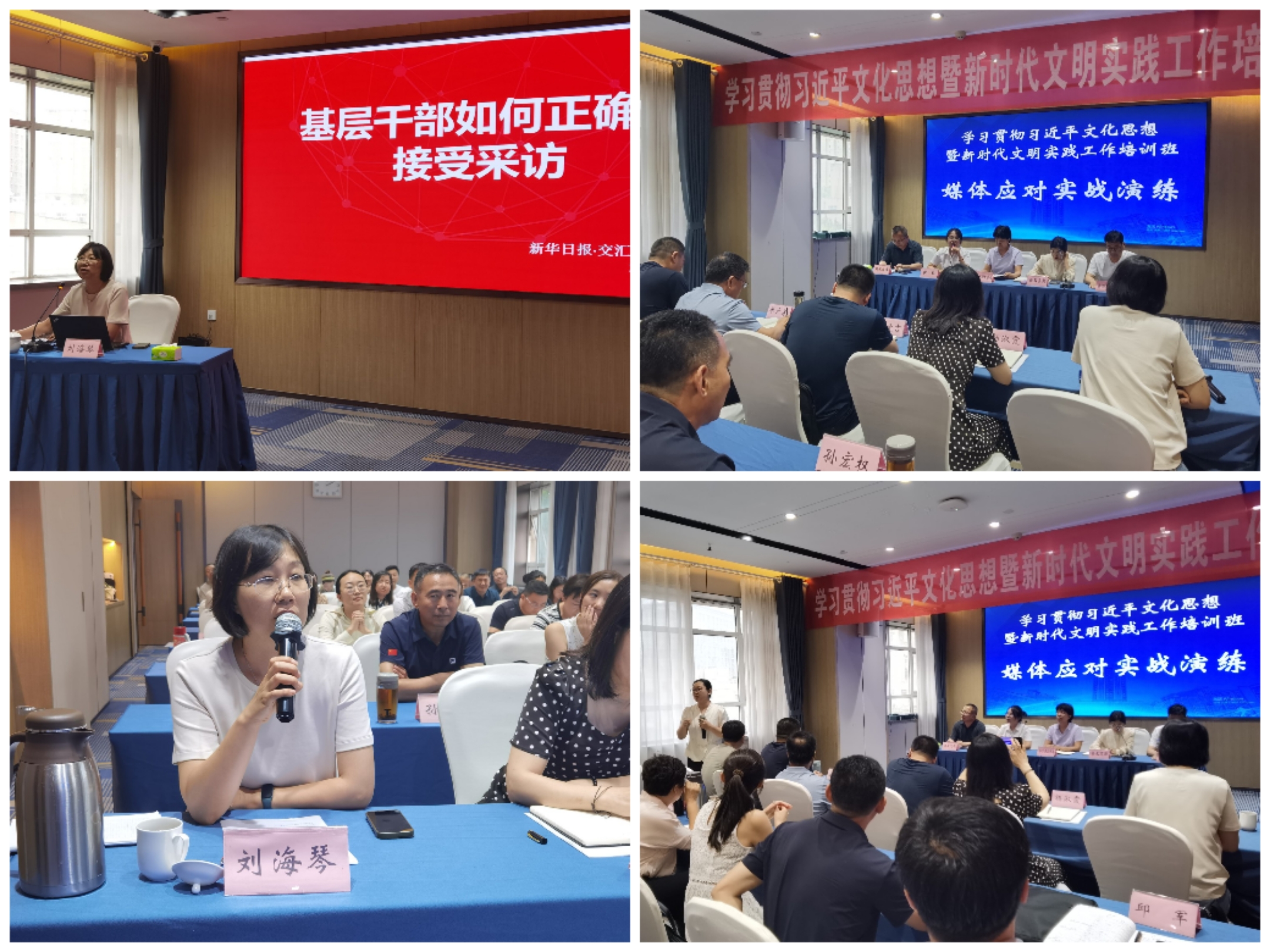 培训班特邀新华日报主任记者刘海琴老师围绕“基层干部如何正确接受采访”传授实战经验,并开展新闻发布会演练,全员参加、情景模拟,还原事件应对处置过程,让每个学员置身其中,在真刀真枪实战演练中促使学员们对突发事件“如何研判”、“如何回应”有了更直观的认识和感受,提升了采访应对处置能力。