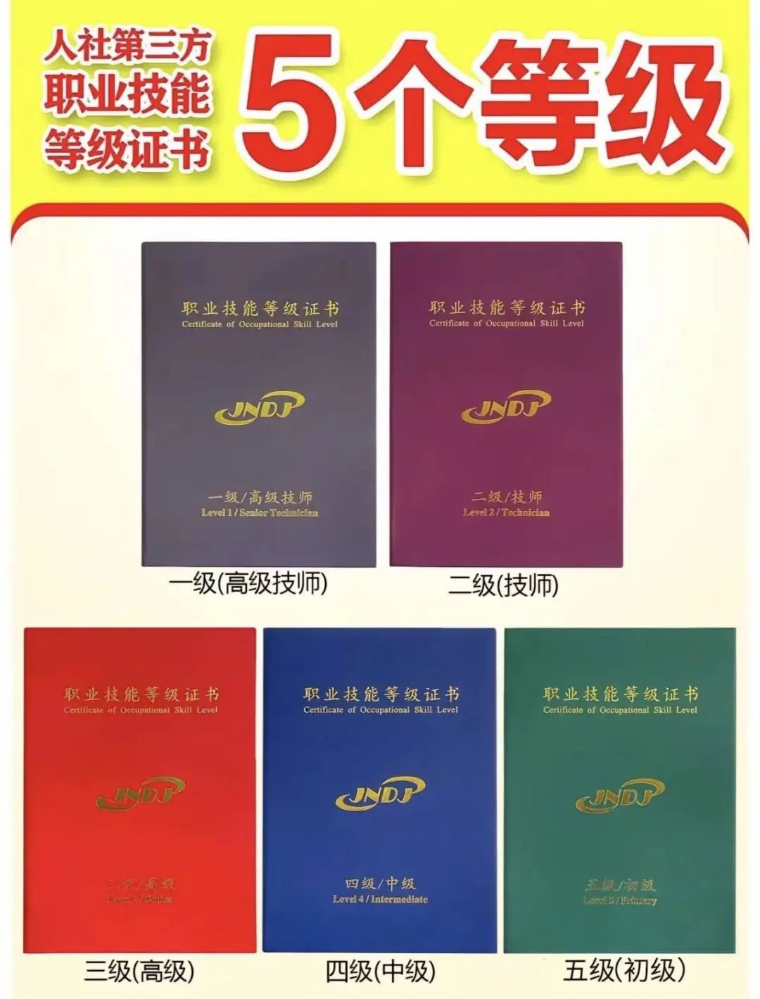 国家职业技能等级证书, 由国家劳动部门组织考试和颁证。国家职业资格证书分为五个等级,即初级、中级、高级、技师、高级技师。