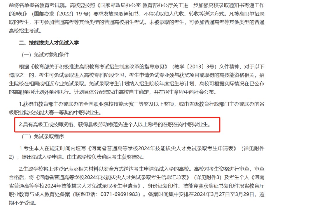 具有高级工或技师资格的在职在岗中等职业学校毕业生可以免去单招考试,直接就读高职院校,这为技术技能型人才提供了更多的教育机会。